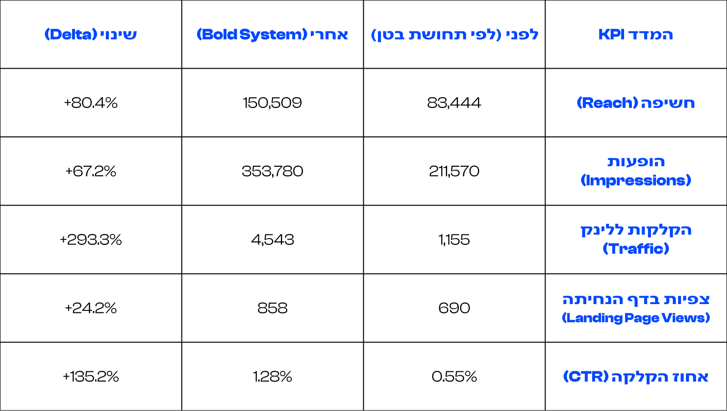 ביצועי מדיה: מאינטואיציה לסיסטם (Media Performance: 30-Day Comparison) לא רק שנפח החשיפה גדל משמעותית, אלא שאיכות התנועה עברה אופטימיזציה קיצונית. הזינוק ב-CTR (פי ~2.35) מוכיח שהקריאייטיב, המסרים ואפיון קהלי המטרה שלנו פגעו בול בפרסונות הנכונות